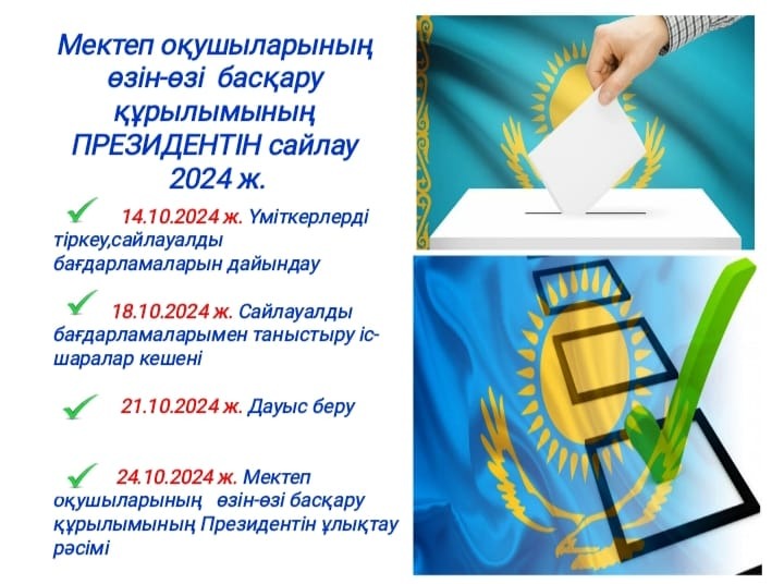 ✅2024 жылғы 21 қазанда 8-10-сынып оқушылары арасында мектеп Президентін сайлауы өтеді.Ниет білдірушілер өз кандидатураларын ұсына алады.